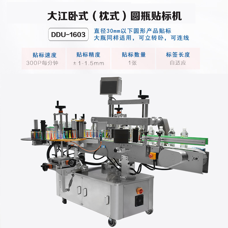 DDU-1603 立式圓瓶定位貼標機 適用范圍:用途廣泛!主要適用于醫藥、日化、食品等行業的圓柱形包裝容器或小錐度的圓錐形包裝容器的單標、雙標自動定位貼標.該機拓展性強!可選配各類打印機完成在線實時打印,可單機使用,亦能連接生產線使用 主要性能結構特點:1、中英文觸…